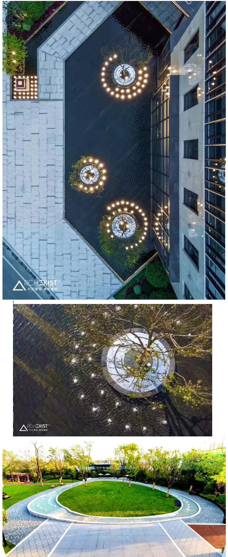 | 另外一種視覺(jué)享受,它是水中的種植池,有樹(shù)有草有石,一圈外圍隨型而置的燈光,好似珍珠散落。 |